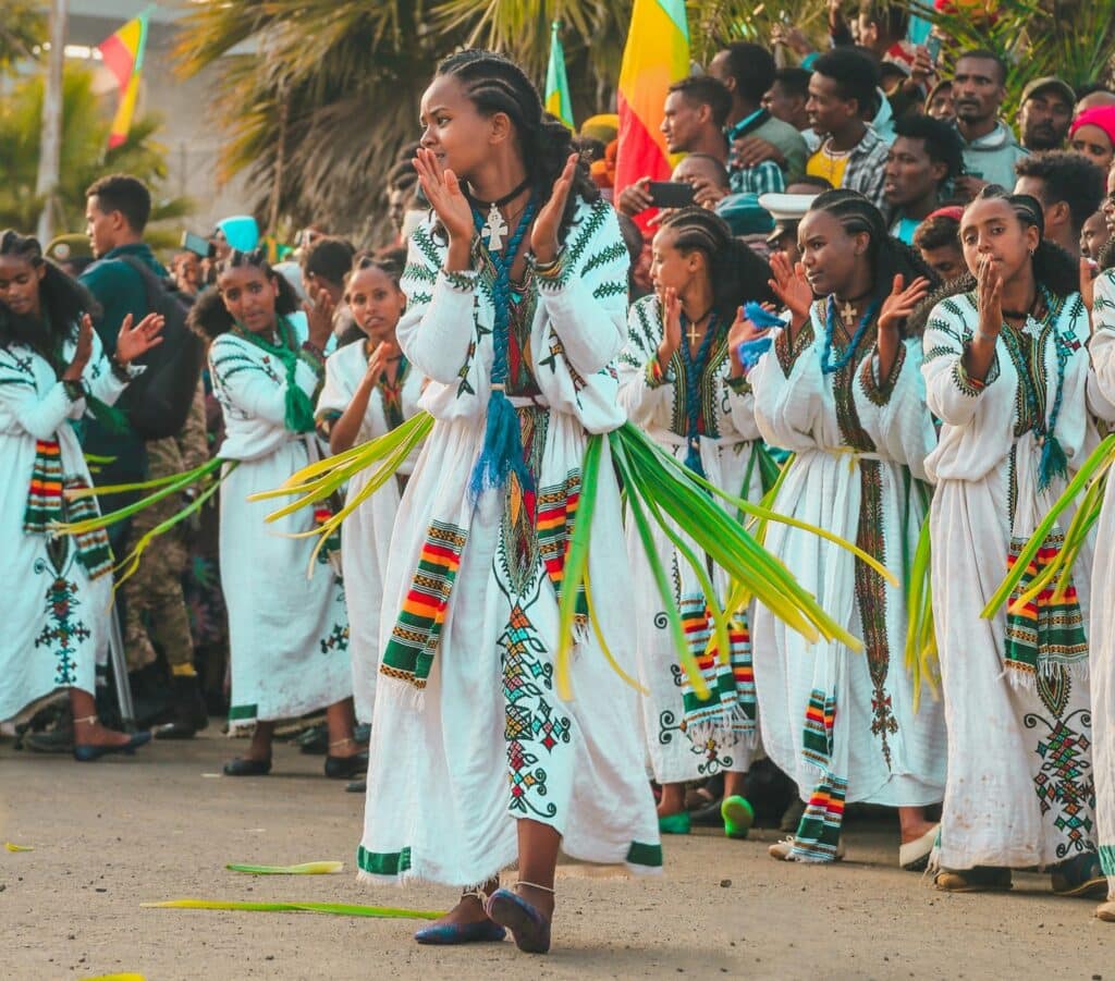 הרחובות בערים המרכזיות של מחוזות תיגראי (Tigray) ואמהרה (Amhara) הופכים לנהר גועש של שמלות לבנות מסורתיות, תכשיטי זהב וכסף בוהקים, וצרורות של עשב ירוק הקשור למותני החוגגות.